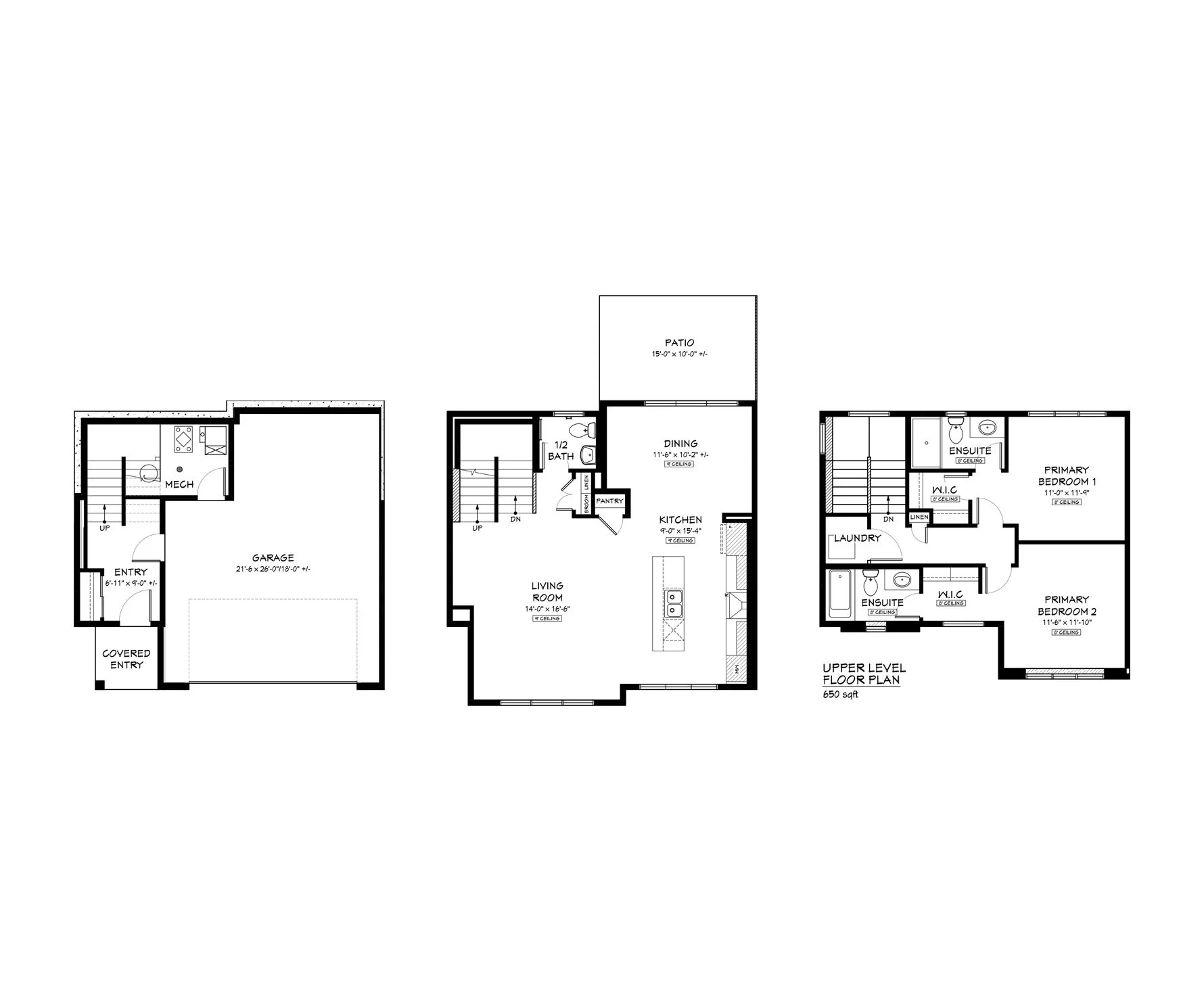 The main level opens into a bright open-concept layout where the living room, kitchen, and dining area connect effortlessly, with a pantry and half bath rounding out the space. A rear patio with privacy screen gives you a private outdoor retreat just steps from your kitchen. Upstairs, two spacious primary bedrooms each come with their own ensuite and walk-in closet, plus a centrally located laundry room for added convenience. The lower level features a covered entry and double attached garage, keeping arrivals and departures effortless.